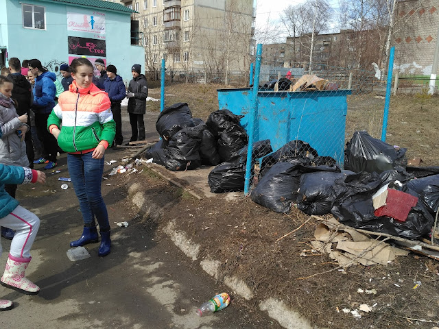 школы. В нашу задачу входило убрать весь вытаявший из-под снега мусор: жестяные банки, бумагу, пластиковые бутылки.